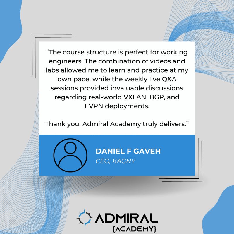 Admiral Academy pairs structured, weekly learning objectives with hands-on labs, instructor office hours, and live Q&A—while also providing on-demand video lessons so students can learn at their own pace. The format is built for working network engineers, MSPs, and ISPs who want deep training without travel or week-long downtime.