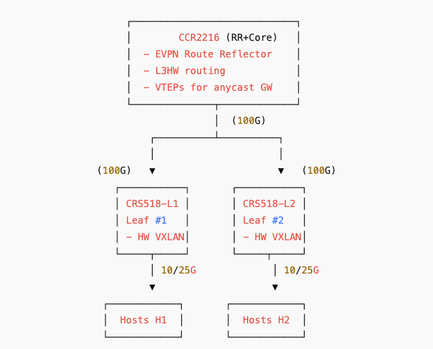 - BGP RR on CCR2216 + VXLAN leaf/spine on CRS518